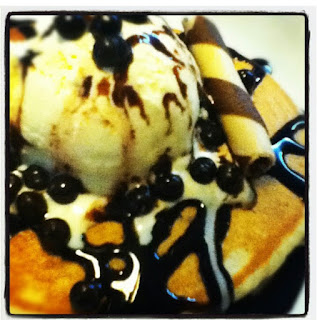 Makanan yang kedua adalah sajian penutup panekuk yang disajikan dengan eskrim yang berlumuran coklat dingin.